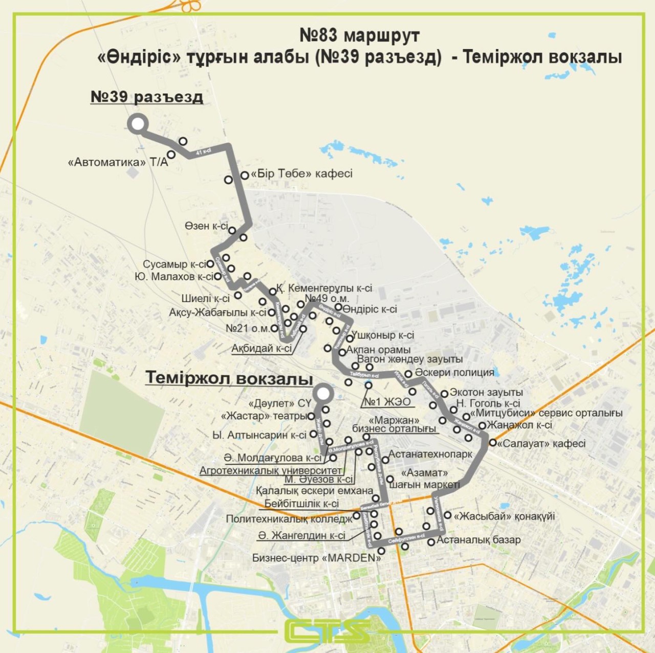 Бүгіннен бастап №83 жаңа бағдар «Өндіріс» тұрғын алабы (№39 разъезд) – Теміржол вокзалы аралығында жүреді, деп хабарлайды Elordainfo.kz.