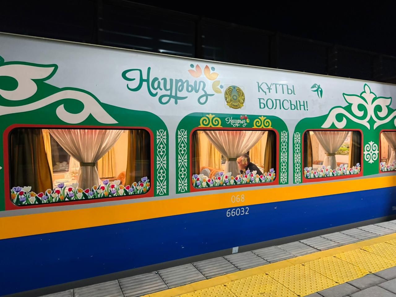 Наурыз мейрамы күні «Нұрлы жол» вокзалының перронынан ұлттық нақышта безендірілген №85/86 «Астана – Шымкент» пойызы сапарға аттанды, деп хабарлайды Elordainfo.kz «Жолаушылар тасымалы» компаниясына сілтеме жасап.