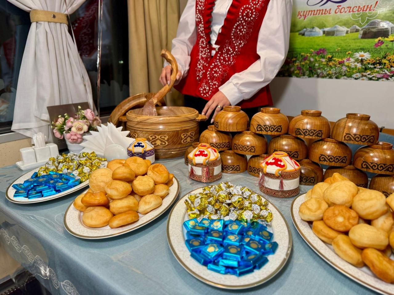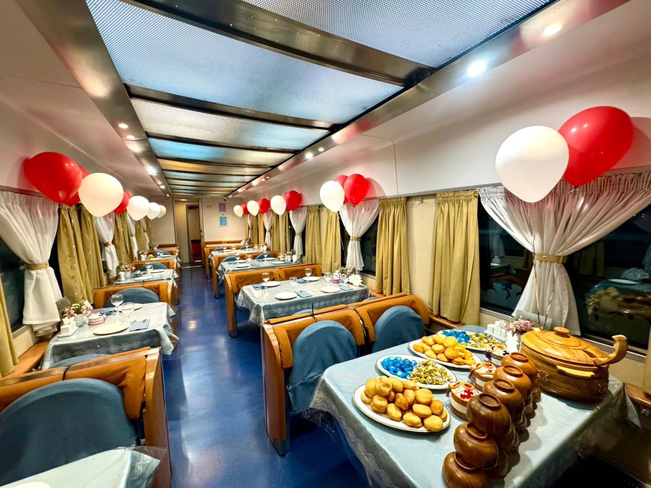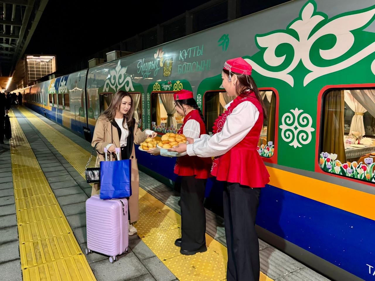 Жолаушыларды перронда ұлттық киім киген жолсеріктер қарсы алып, ерекше мерекелік көңіл-күй сыйлады. Әрбір жолаушыға ұлттық тағам - наурыз көже мен бауырсақ ұсынылды.