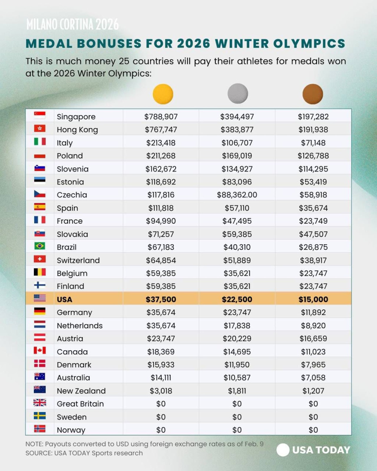Ең бірінші орында Сингапур орналасқан. Олар алтын медаль иегеріне 788 мың доллар, күміс жүлдегерге – 394 мың доллар, қола жүлдегерге 197 мың доллар береді. Әйтсе де бұл ел өз тарихында небәрі екінші мәрте қысқы Олимпиадаға қатысып жатыр. Миланға тау шаңғысынан 23 жастағы Фаиз Баша ғана жолдама алған.
