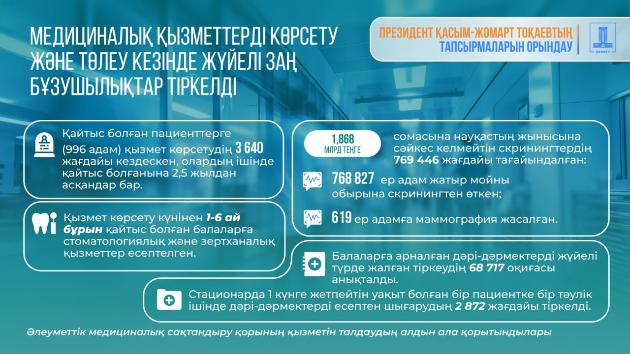 996 қайтыс болған пациентке медициналық қызмет көрсетудің 3 640 оқиғасы анықталды, мысалы 2023 жылы қайтқан адамды 2025 жылы қабылдауға жазған, (қайтыс болғаннан кейін 2,5 жыл өткен соң). 1,8 млрд теңгеге пациенттің жынысына сәйкес келмейтін скринингтердің 769 446 жағдайы тіркелді. Мәселен, 768 827 ер адам әйел ауруларына (жатыр мойны обырына) скринингтен, 619 ер адам маммограммадан өтті деп көрсетілген. Тек бір аудандық ауруханада осындай 11 123 жағдай анықталды (Алматы облысы).