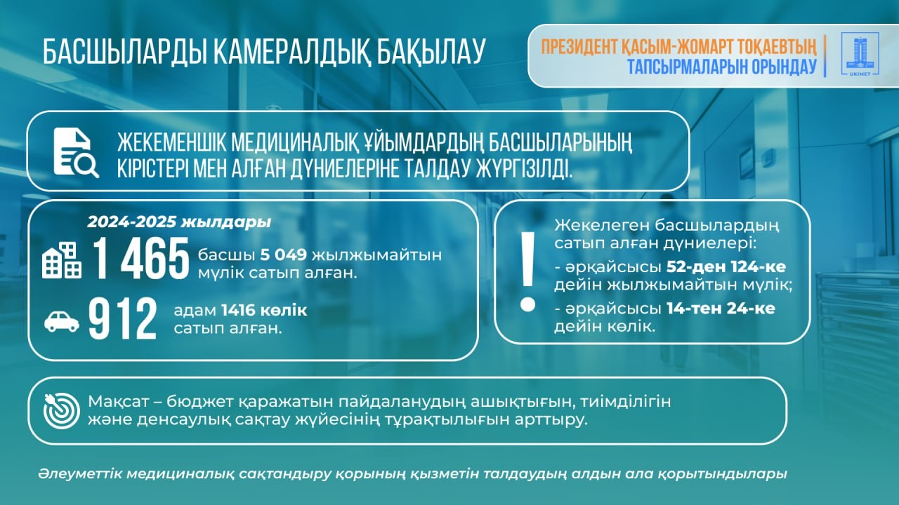Сондай-ақ, салық органдары медициналық ұйымдар басшыларына қатысты камералдық бақылау жүргізіп, олардың табыстары мен сатып алған мүліктеріне талдау жасады. Нәтижесінде 2024-2025 жылдар аралығында 1 465 басшы 5 мыңнан астам жылжымайтын мүлік объектісін сатып алғаны, ал 912 адамның 1 416 автокөлік иеленгені анықталды. Жекелеген басшылардың әрқайсысы 52-ден 124-ке дейін жылжымайтын мүлік объектісін және 14-тен 24-ке дейін автокөлік сатып алған.