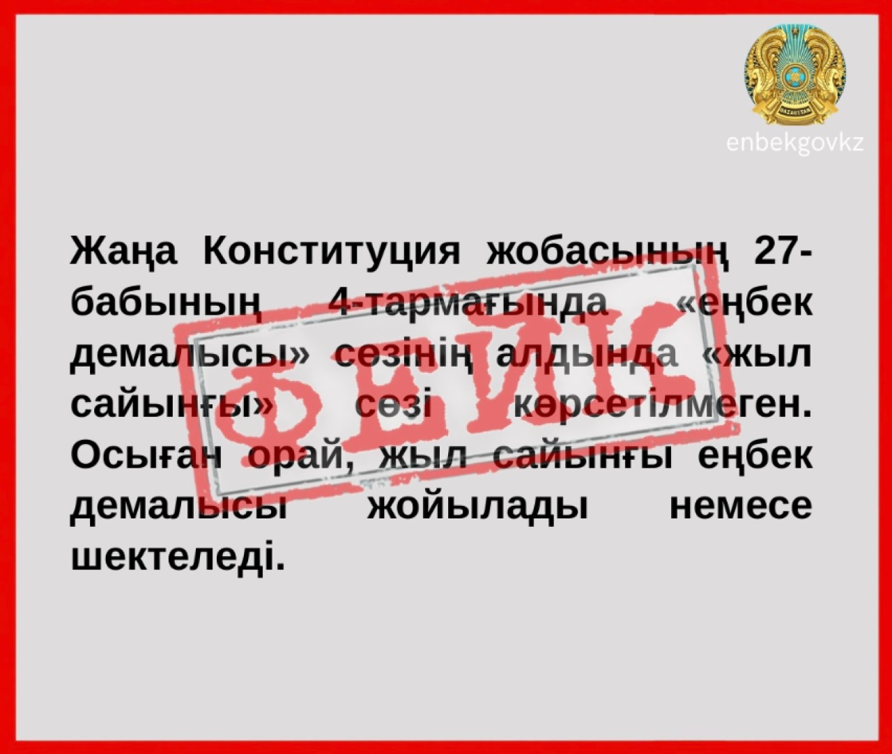 Ақпараттық кеңістікте жаңа Конституция жобасының 27-бабының 4-тармағында «еңбек демалысы» сөзінің алдында «жыл сайынғы» сөзінің болмауы қызметкерлердің құқықтарын шектеуге әкеп соғуы мүмкін деген пайымдаулар таралды. Осыған қатысты ҚР Еңбек және халықты әлеуметтік қорғау министрлігі түсіндірме берді, деп хабарлайды Elordainfo.kz.