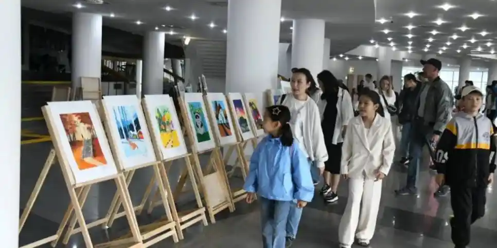 Фойеде әр түрлі жастағы оқушылардың акварель, гризайл, гуашь, акрил, май, қарындаш графикасы, пастель және аралас техникамен жасалған туындыларын тамашалауға болады.