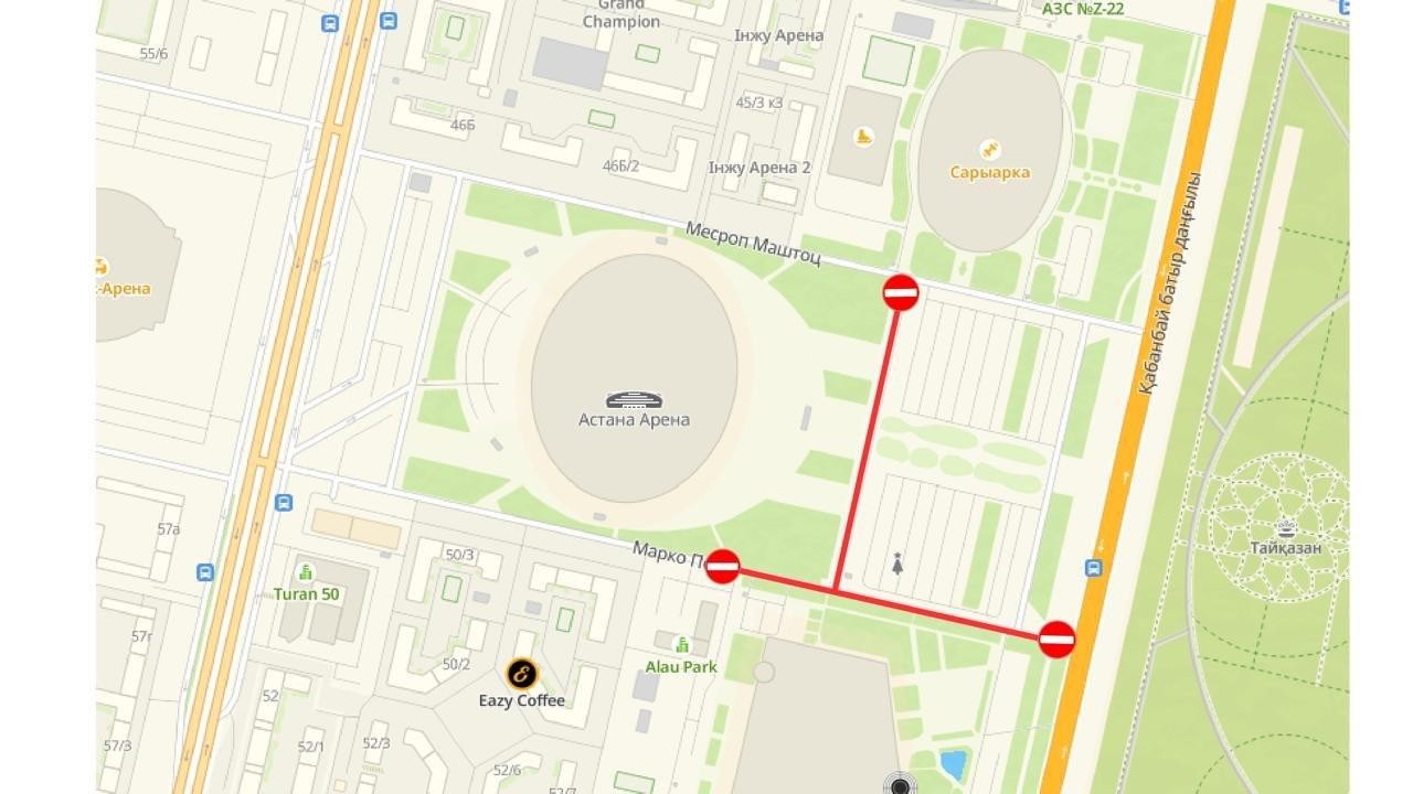 Қауіпсіздікті қамтамасыз ету және келушілер үшін қолайлы жағдай жасау мақсатында іс-шаралар өтетін уақытта «Астана Арена» стадионының маңында көлік қозғалысына уақытша шектеу енгізіледі. Шектеулер «Алау» мұз сарайы жағындағы көше мен «Астана Арена» стадионының шығыс жағындағы көшеге қатысты болады.