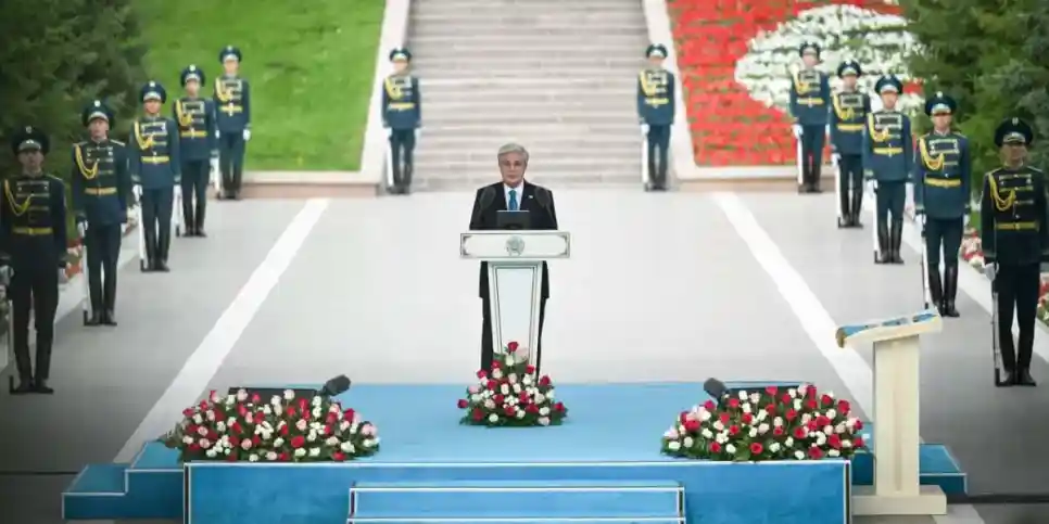 Құрмет қарауылының бастығы салтанатты іс-шараға дайындығы туралы Президентке рапорт берді. Содан кейін еліміздің әнұраны шырқалып, көк байрағымыз көтерілді. Қасым-Жомарт Тоқаев жиынға қатысушыларды Мемлекеттік рәміздер күнімен құттықтап, бұл еліміз үшін мән-маңызы айрықша мереке екеніне тоқталды.